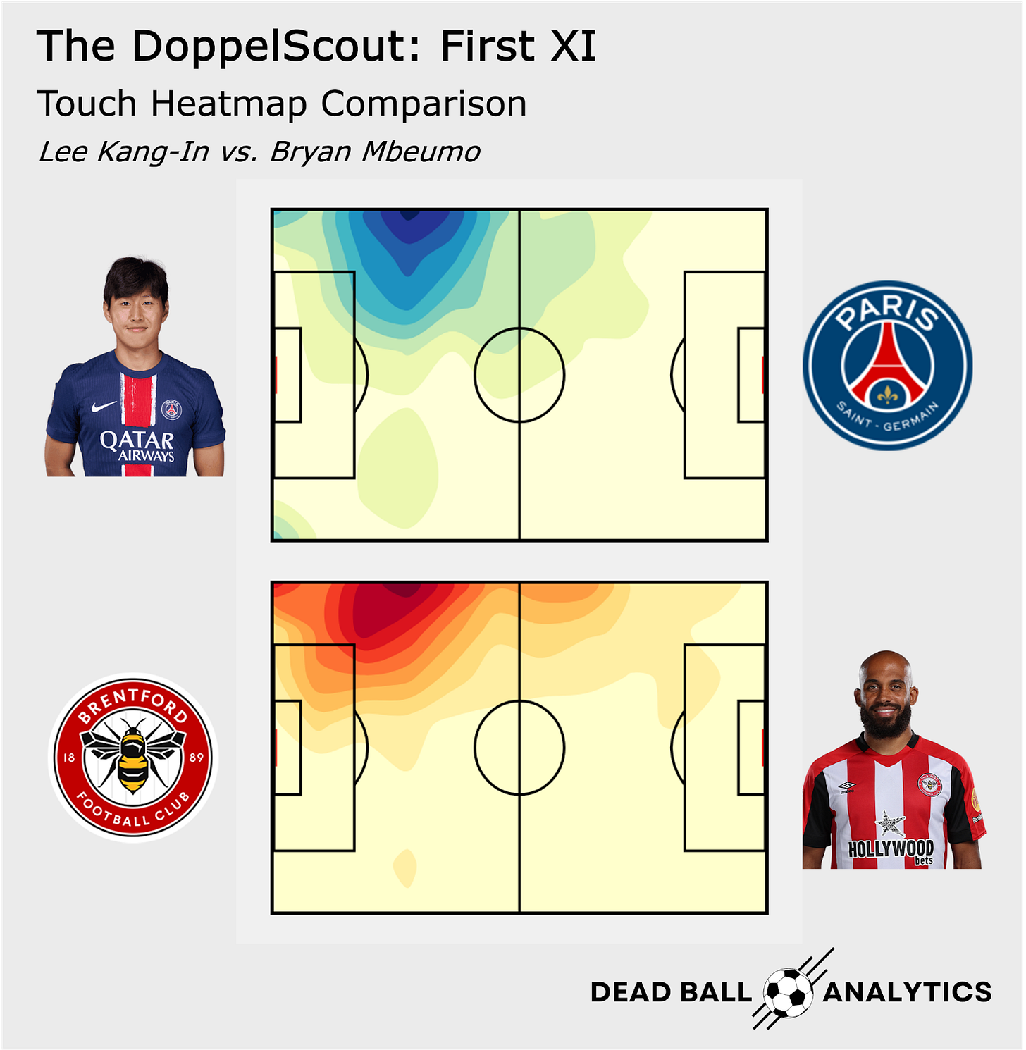 Figure 8: Lee Kang-in and Bryan Mbeumo heat-map comparison