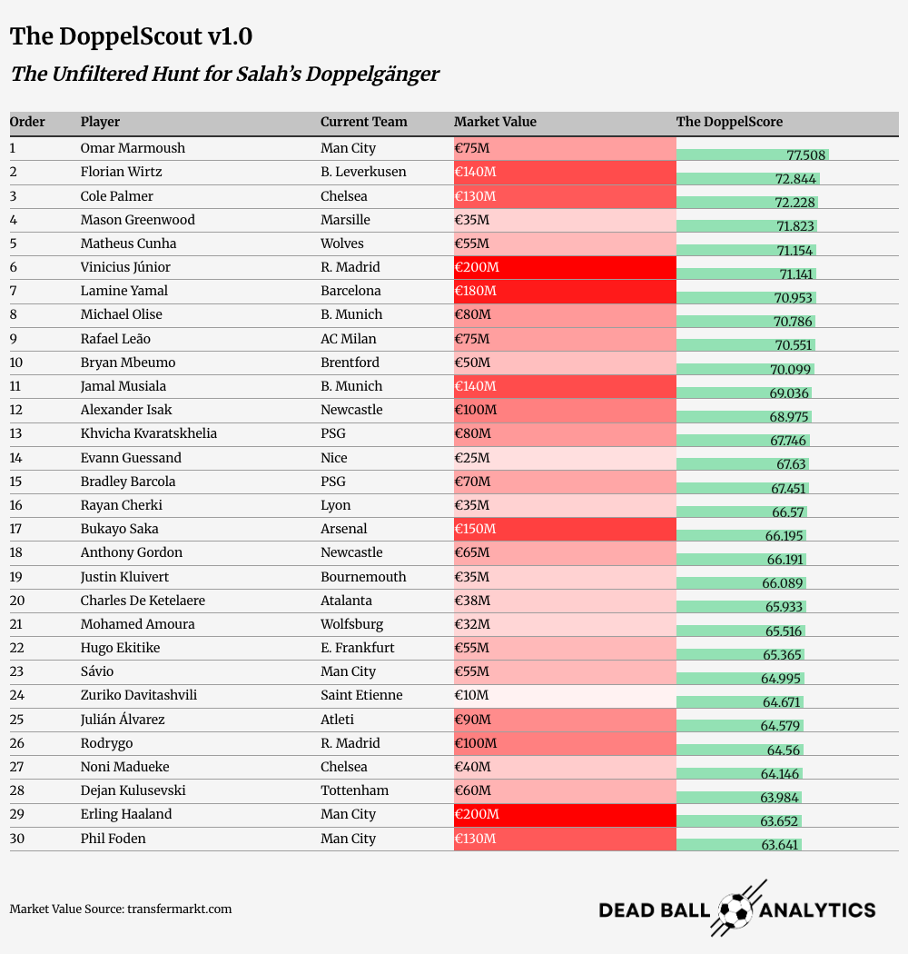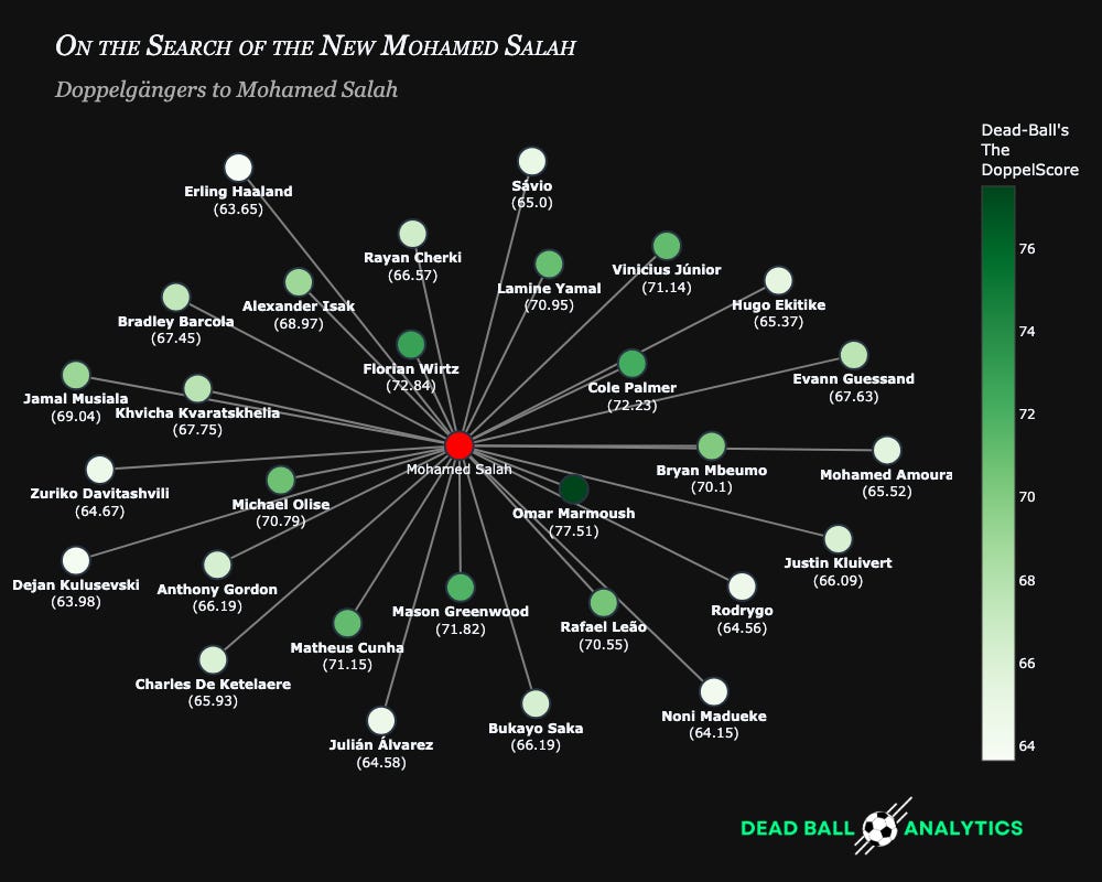 Our first unfiltered draft of Mo Salah’s doppelgängers includes 30 names. Many of them are well-known, but a few unexpected names might catch your eye. This initial list serves as a broad foundation, capturing players with overlapping statistical and tactical profiles. However, not all doppelgängers are created equal—some might share Salah’s goal-scoring prowess, others his positional versatility, and a few his unique blend of consistency and explosiveness. Please see below for the graph representation of these names along with their DoppelScore!