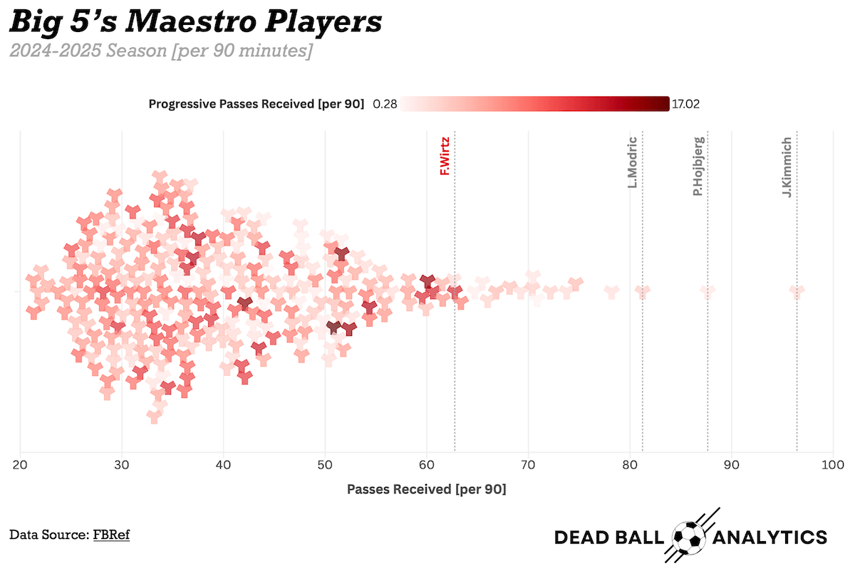 Wirtz’s ability to receive progressive passes isn’t just about positioning, it’s about anticipation, timing, and connectivity. With over 300 progressive pass receptions in the 2024-25 Bundesliga season, Wirtz often finds space between the lines and forces defenders to take a risk. Wirtz doesn’t simply receive the ball, he positions himself as the next logical step in the team’s attacking progression.
