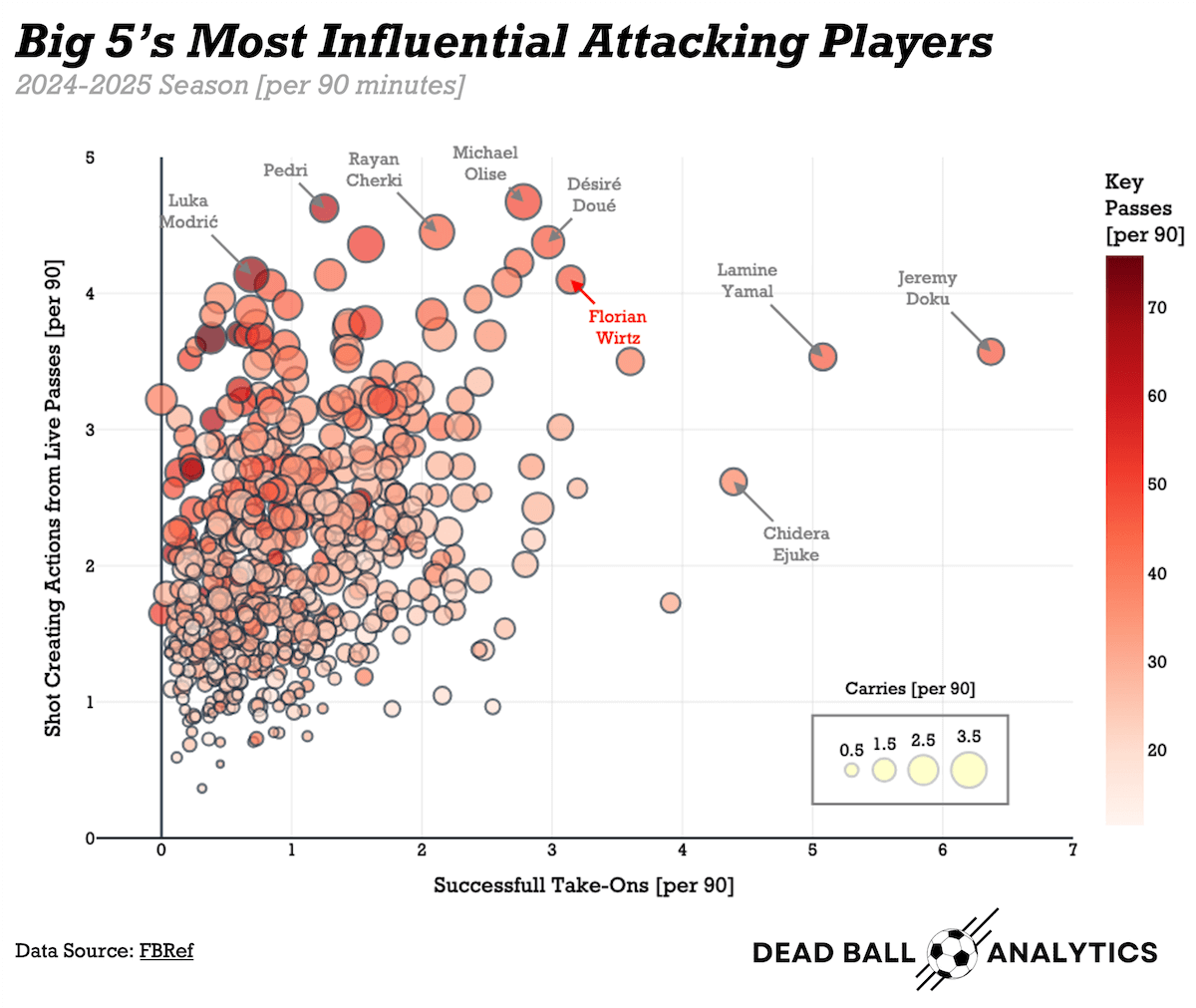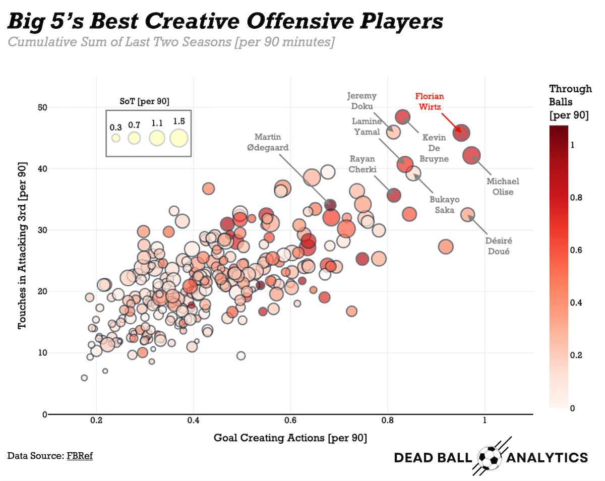 Wirtz ranks 3rd in total Goal-Creating Actions (26) across Europe’s top five leagues, just behind Lamine Yamal (29) and Mohamed Salah (27), and ahead of names like Raphinha, Michael Olise, and Omar Marmoush. His direct contributions to goals place him among the most valuable attacking threats of the season. Per 90, his influence becomes even clearer. Wirtz averages 0.99 Goal-Creating Actions per 90, ranking third this time, behind Bukayo Saka (1.20) and Desire Doue (1.25). Figure below extends these GCA numbers to the last two seasons, along with Through Balls, Touches in Attacking 3rd and SoT. Wirtz is still topping (with Olise, Doue and Saka) the list for these stats, which is another sign of his consistency.