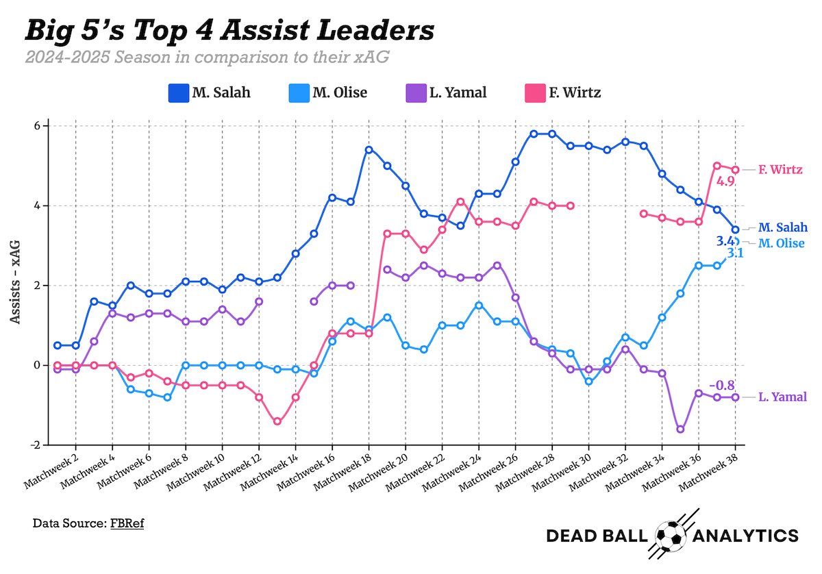 Florian Wirtz brings a rare blend of technical brilliance and tactical versatility. Whether he's playing on the left or in the middle, centrally behind the striker, his influence on the game remains consistent. He’s not just a talented player, he’s also a solid helper in possession and a capable finisher. That all-around profile makes him a dream target for Europe’s elite. Earlier this season, in our Dead Ball Analytics piece, we specifically highlighted Florian Wirtz as one of the top candidates when searching for Mohamed Salah’s stylistic doppelgängers. If you missed that article, we highly recommend checking it. 🔗 Read the full article here.
