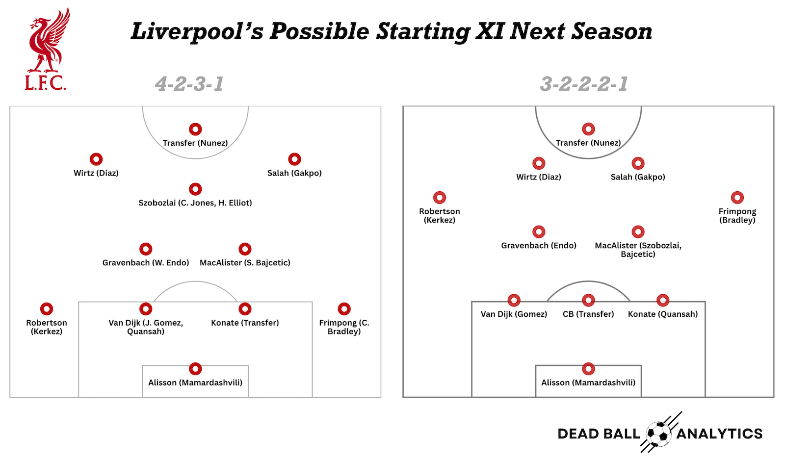 In a potential 4-2-3-1 setup, the starting XI might look like this: Alisson (GK), Frimpong, Van Dijk, Konate (Transfer), Robertson(Kerkez), Gravenberch, Mac Allister, Szobaslai, Salah, Wirtz, and potential no:9 (if signed), offering a balanced and potential attacking threat. However, with a possible signing technically elite and a ball-playing centre back, Liverpool could shift to a 3-4-3 or 3-2-2-2-1 formation, allowing Wirtz to operate as a central playmaker while Frimpong and Robertson (Kerkez) provide width as wing-backs, creating a more defensively solid yet tactically versatile setup.
